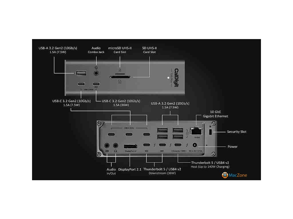 TS5 Plus je poháněna nejnovější technologií Thunderbolt 5 a rozšiřuje pracovní postupy Mac a PC díky nejpokročilejšímu výběru portů, jaký kdy dokovací stanice Thunderbolt obsahovala.