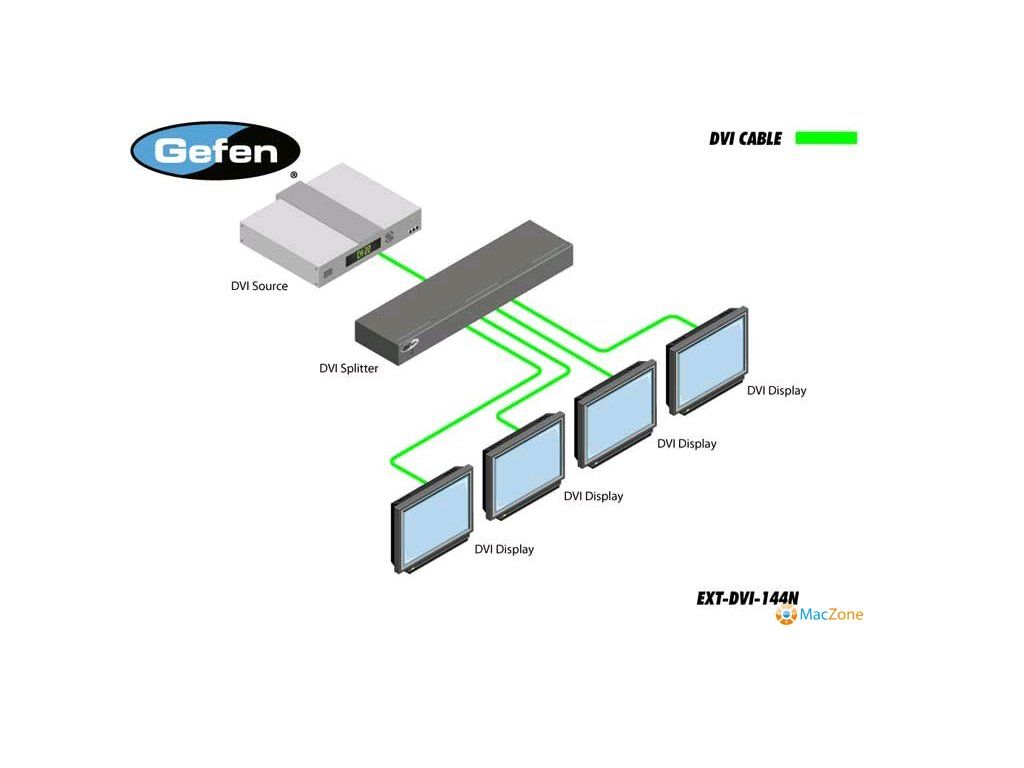 Gefen's 1:4 DVI Splitter is a distribution hub that sends the same DVI graphics source to up to four DVI digital displays (flat panels