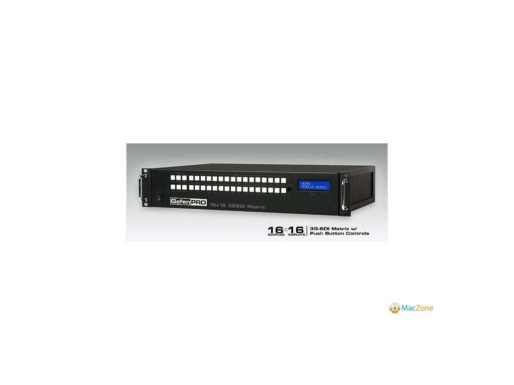 Gefen Pro 16x16 3G-SDI matrix - matice 16x16 pro 3G-SDI GEF-3GSDI-16416-PB - nasměrujte až 16 3G-SDI vstupů na libovolný výstup ( včetně směrování 1 vstupu na více výstupů) . Verze matice s ovládacími tlačítky ( Push Buttons) na čelním panelu.Gefen 3G-SDI matice umožňuje směrování signálů bez ztrátky kvality, zjednodušuje instalace a tvoří je velmi flexibilními co do konfigurace, která se může často měnit. Lze ovládat pomocí čelních tlačítek, IR dálkového ovládání , přes www rozhraní (IP control) , RS-232 port nebo pomocí Gefen Keyboard kontorleru ( z klávesnice , software pro Win i Mac ) , Jednotka obsahuje redundantní zdroje a je připravena pro instalaci do racku. Existuje i shodná, mírně levnější jednotka bez tlačítek (GEF-3GSDI-16416 - pro instalace v serverovnách )