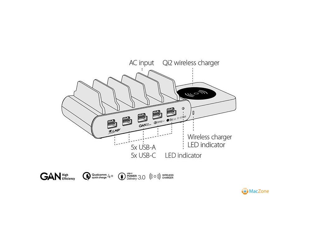 LMP DuoCharge 5+1 Port 150 W GaN nabíjecí stanice s Qi2 nabíjecí podložka iPhone, iPad , Apple Watch
