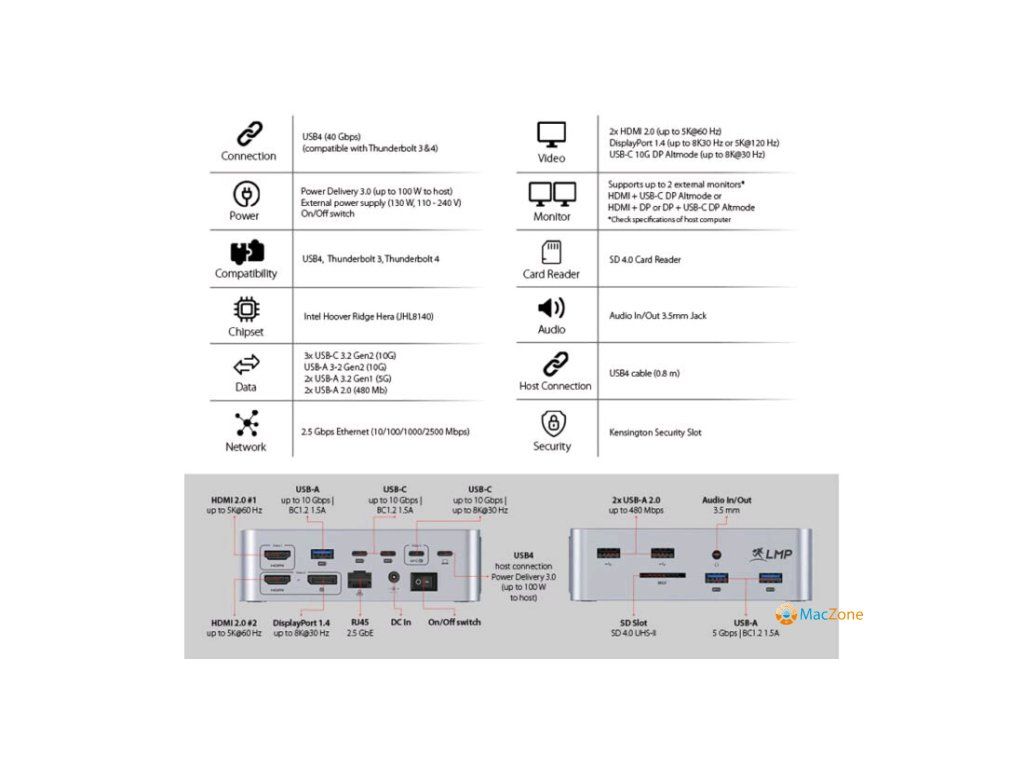 LMP SuperDock 2 je all-in-one řešení USB4, které se může pochlubit 15 porty pro bezproblémový přenos dat, konektivitou videa a zvuku ve vysokém rozlišení a rychlým a spolehlivým síťovým přístupem přes jediný kabel USB4. Díky čipové sadě Intel JHL8140 je plně kompatibilní s Thunderbolt 3 a 4. Díky 130W napájecímu adaptéru dodává SuperDock 2 až 100 W (Power Delivery 3.0) každému notebooku, který lze nabíjet přes USB4 nebo Thunderbolt 3 nebo 4, např. jako MacBook Pro/Air. SuperDock 2 je kompatibilní s macOS a Windows OS.Celkem 8 USB portů – 4 na přední a 4 na zadní straně – zajišťuje připojení téměř jakékoli USB periferie k hostitelskému počítači. Rychlosti se pohybují od rychlých 10 Gb/s do 5 Gp/s a až po USB 2.0 (480 Mb/s) pro nízkorychlostní periferie, jako je klávesnice a myš. Porty USB-A a USB-C také poskytují výkon až 7,5 W (BC1.2 1,5 A) pro nabíjení iPhonu nebo jiných USB-C zařízení.