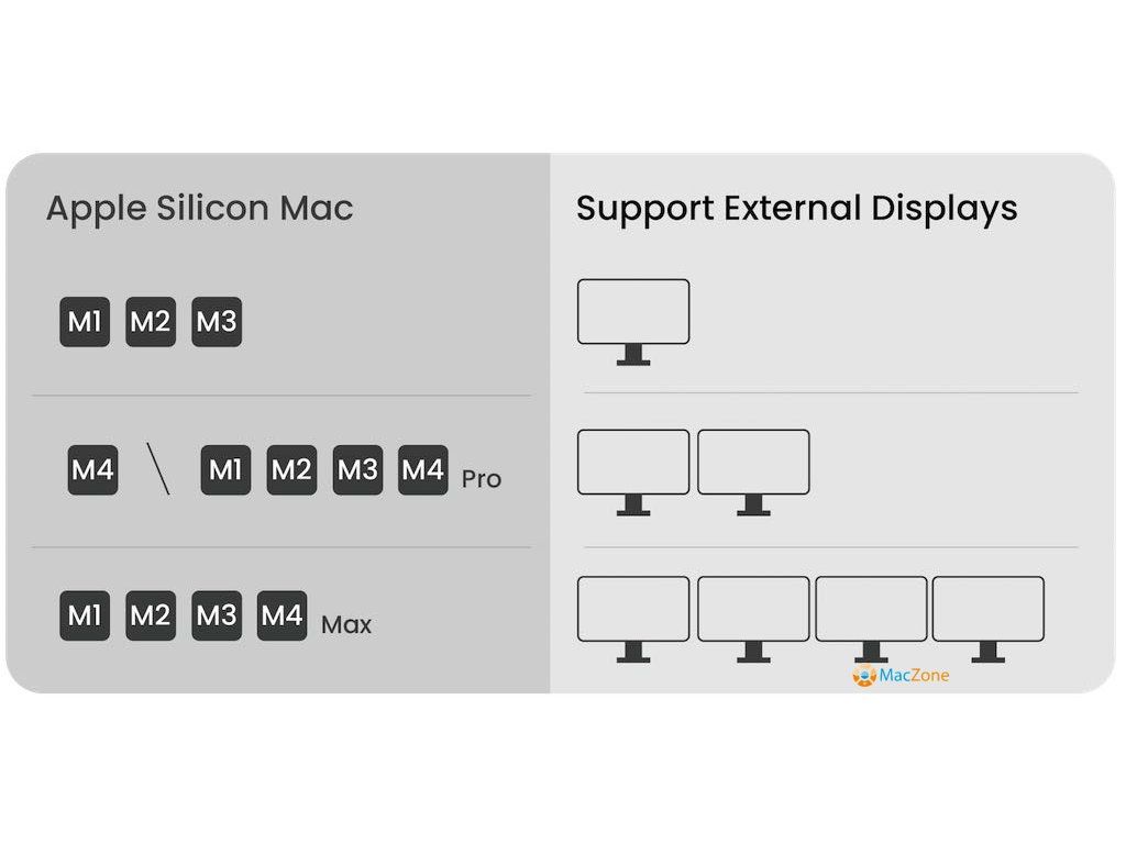 Modely Maců Apple M1/M2/M3 Pro, M1/M2/M3 Max a M1/M2 Ultra, modely Maců Apple s procesory Intel a počítače s rozhraním Thunderbolt 4 mohou prostřednictvím rozhraní Thunderbolt podporovat až dva displeje s rozlišením až 4K @ 60 Hz.