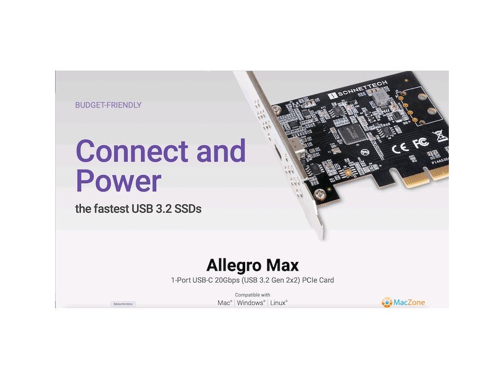 Sonnet Allegro MAX USB-C PCIe karta 20GBps pro Apple MacPro USB3C-1M20G-E . To nejrychlejší USB, které můžete v PCIe kartě mít. Kompatibilita Mac, PC, Linux, expanzní šasi. Až 2000 MB/s . 1port USB-C USB 3.2 gen 2x2Doplňkové parametry