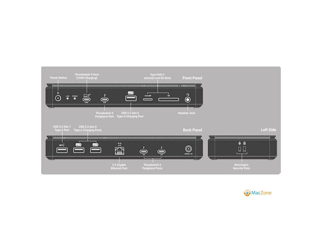 - Dvanáct externích rozhraní - Obsahuje čtyři porty Thunderbolt 5, tři nabíjecí porty USB 3.2 Gen 2 typu A, jeden port USB 3.2 Gen 1 typu A, jeden port RJ45 2,5 Gigabit Ethernet a jeden kombinovaný audio konektor 3,5 mm; jeden slot pro kartu SD a jeden slot pro kartu microSD